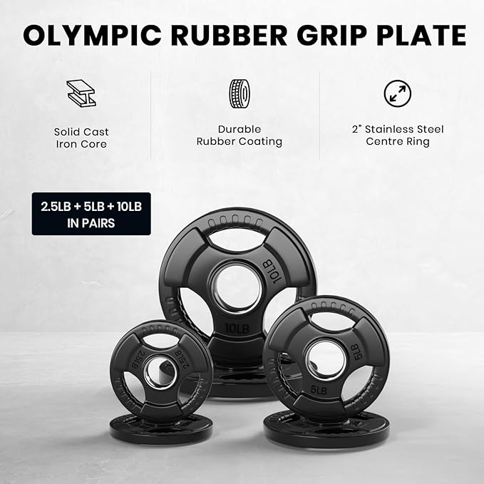 - Solid and Ultra Durable Weight Plates: Made of heavy-duty cast iron with a machined stainless-steel hub to ensure a reliable weight that will last through grueling workouts. Each plate has 3 openings with strips on them for easy and secure grip when loading and unloading the weights. Coated with dense rubber to alleviate damage to floor and labeled in LB for easy recognition, the plate set forms a great complement to the training bar.