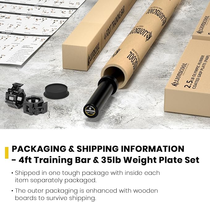 - Reliable Packaging & Warranty: The whole set is shipped in one tough package with inside each item separately packaged and training bar is double packaged with sturdy tube and thick cardboard box. The outer packaging is enhanced with wooden boards to survive shipping. And we offer a Workout Poster, empowering you to plan your workouts like a professional. We offer limited lifetime warranty on our training bar and one-year warranty on the weight plates.