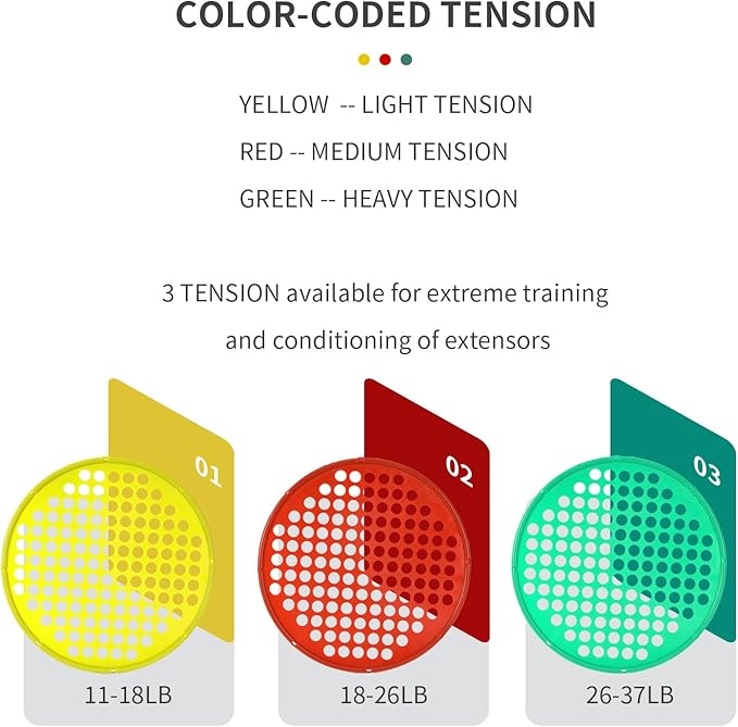 - Adjustable Resistance on the Go - Easily modify the resistance by adjusting your hand position or finger depth in the cutout holes. Choose from Three color-coded resistance levels, ranging from light (Yellow) to x-heavy (Green), and one plus size: 14" diameter. The resistance finger webs cater to various strength-building needs.