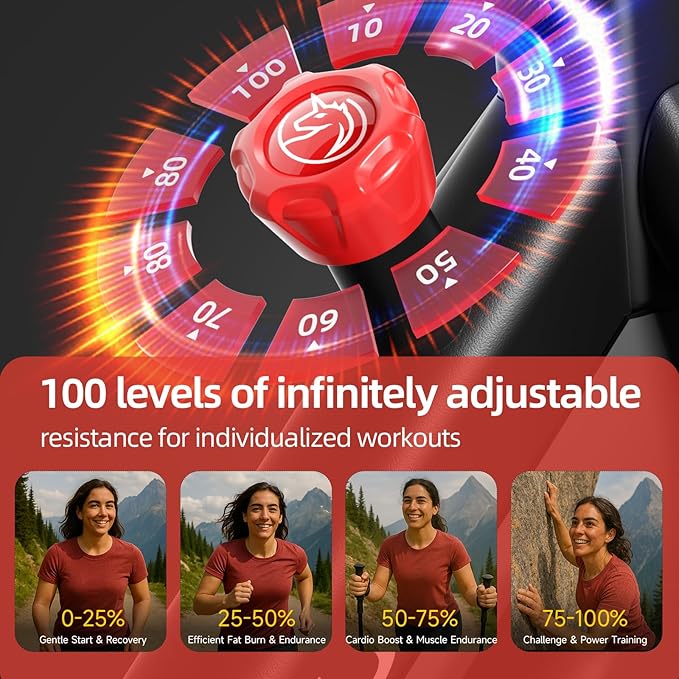 - Smooth & Silent Magnetic Resistance with 100 Levels: Experience ultra-quiet, smooth rides thanks to the advanced magnetic resistance system. Adjust across 100 levels to perfectly match your warm-up, HIIT, or recovery training needs.
