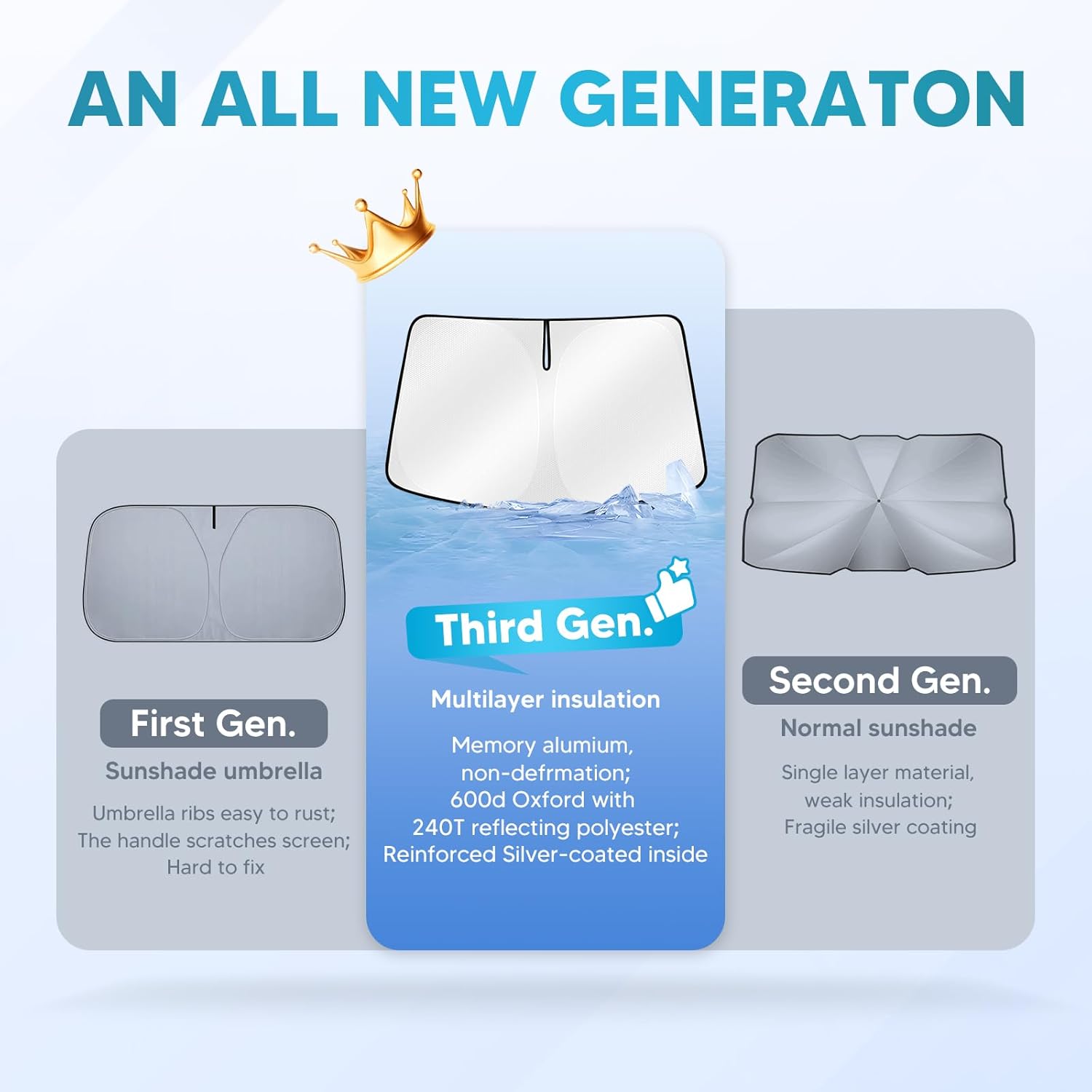 - 【Double Protection Materials】-- The sunshade is made of two layers of protective materials. The front side is silver-coated high-density 240T sun blocker screen protector material, which has a stronger reflective effect on UV rays and sun heat compared with the cheaper 170T/190 Tone. The back side is a heat insulation layer to prevent UV damage to people and car interiors.