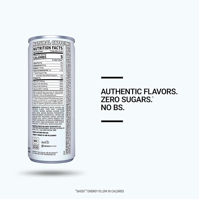 - Total Transparency: All GHOST products feature a transparent label that fully discloses the dose of each active ingredient. Zero proprietary blends means you know what you’re getting in each and every sip. GHOST Energy is vegan friendly, gluten free, and contains zero sugars.* *GHOST Energy is low in calories.
