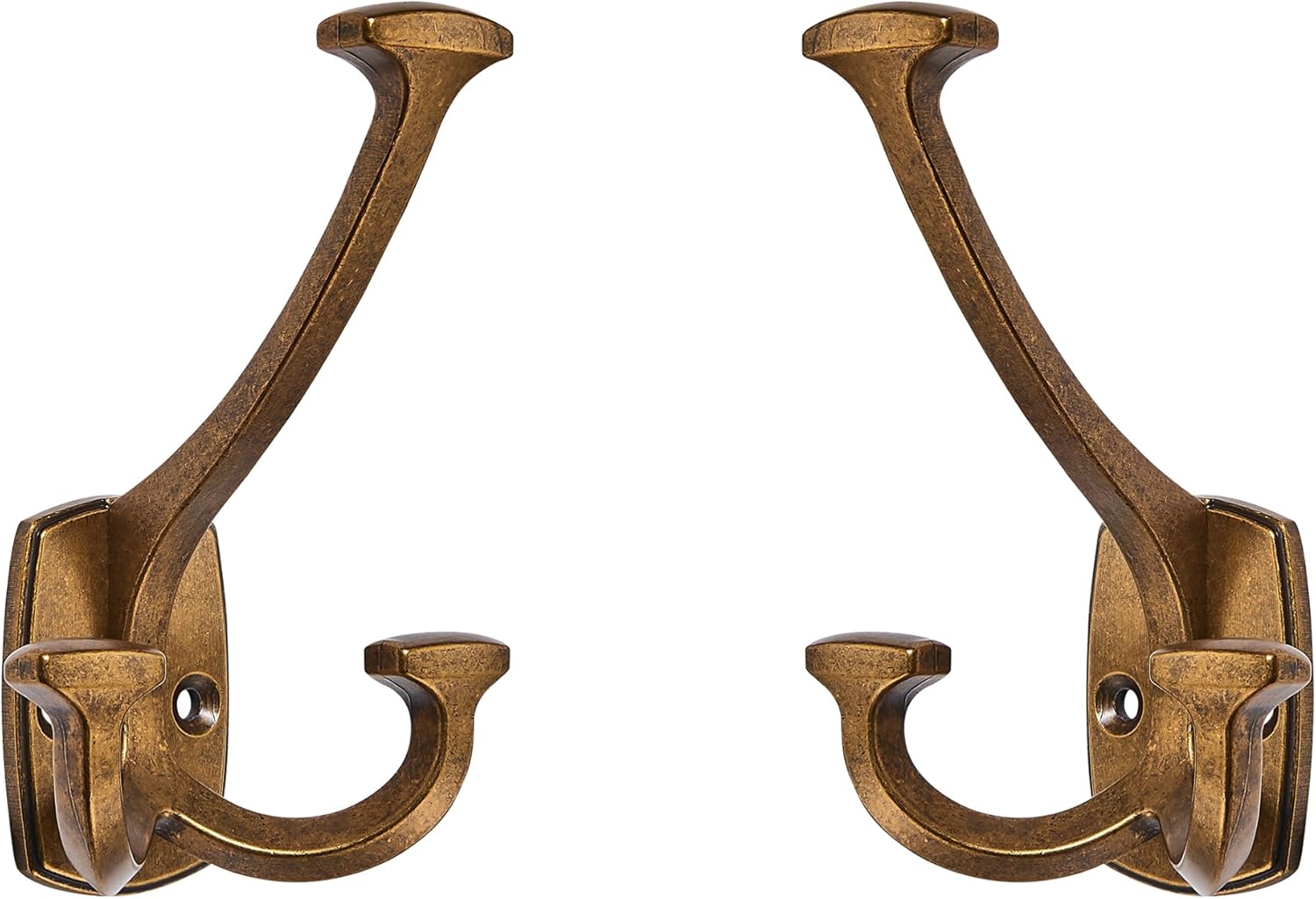 Large Wall Double-Sided Hook 5 Pack Antique Brass Hook Decorative Heavy Duty Solid Large Coat Hooks for Towel Hanging Coats Robe Towel Bags Door Back 2 Prong Hooks