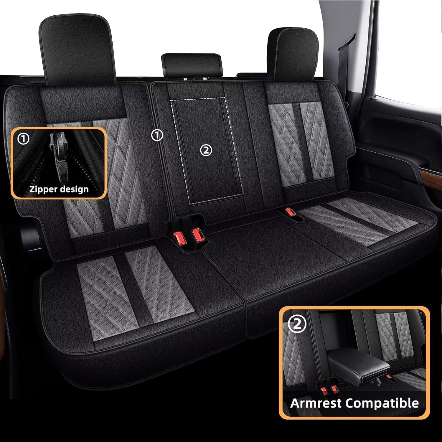 - 【Design Excellence】Rear seat covers 1:1 collection of original vehicle data, tight and non displaced, without affecting the use of safety buckles, the armrest cushion connection between the backrest is zippered, making it easy to disassemble and assemble. It is retractable, When it unfold,can provide elbow space for rear passengers. if you fold it up, the back seat can provide spacious space for your family and pets.