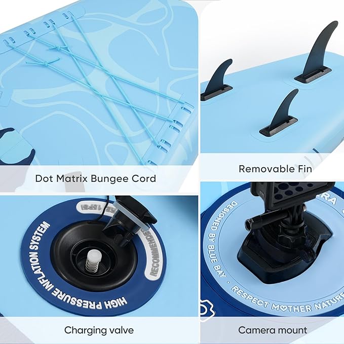 - Complete Premium Accessories : Includes an adjustable sup paddle, three detachable fins, safety leash, dual-action high-pressure pump, waterproof phone pouch, repair kit, user manual, and a large-capacity backpack. Multiple D-rings on the board allow for securing gear or connecting with other paddle boards