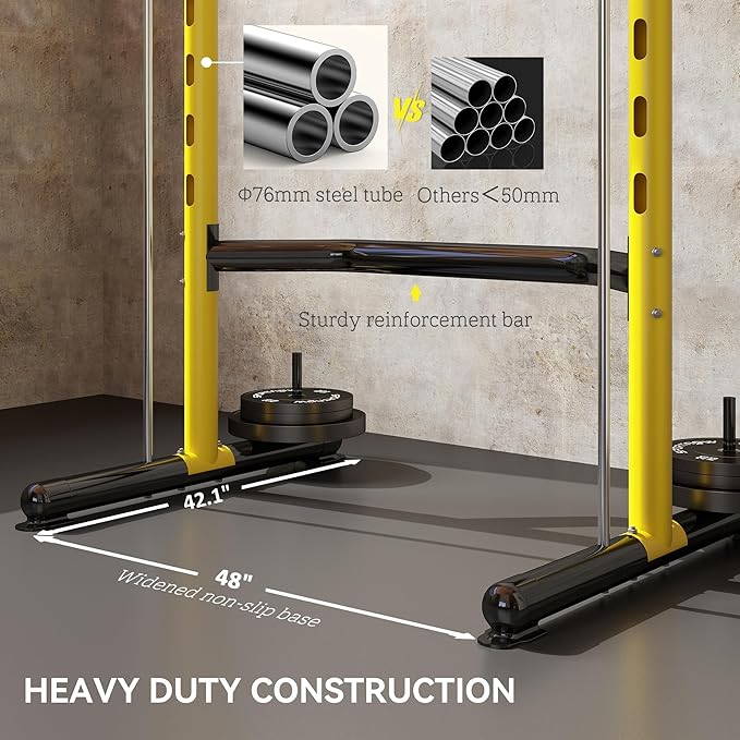 • Heavy-Duty Construction: Made of a 3-Inch diameter steel tube, the squat rack for home gym is solid enough for your daily squats and bench presses. The pull-up bar and curved support brace mean more workout space and nothing to trip over
