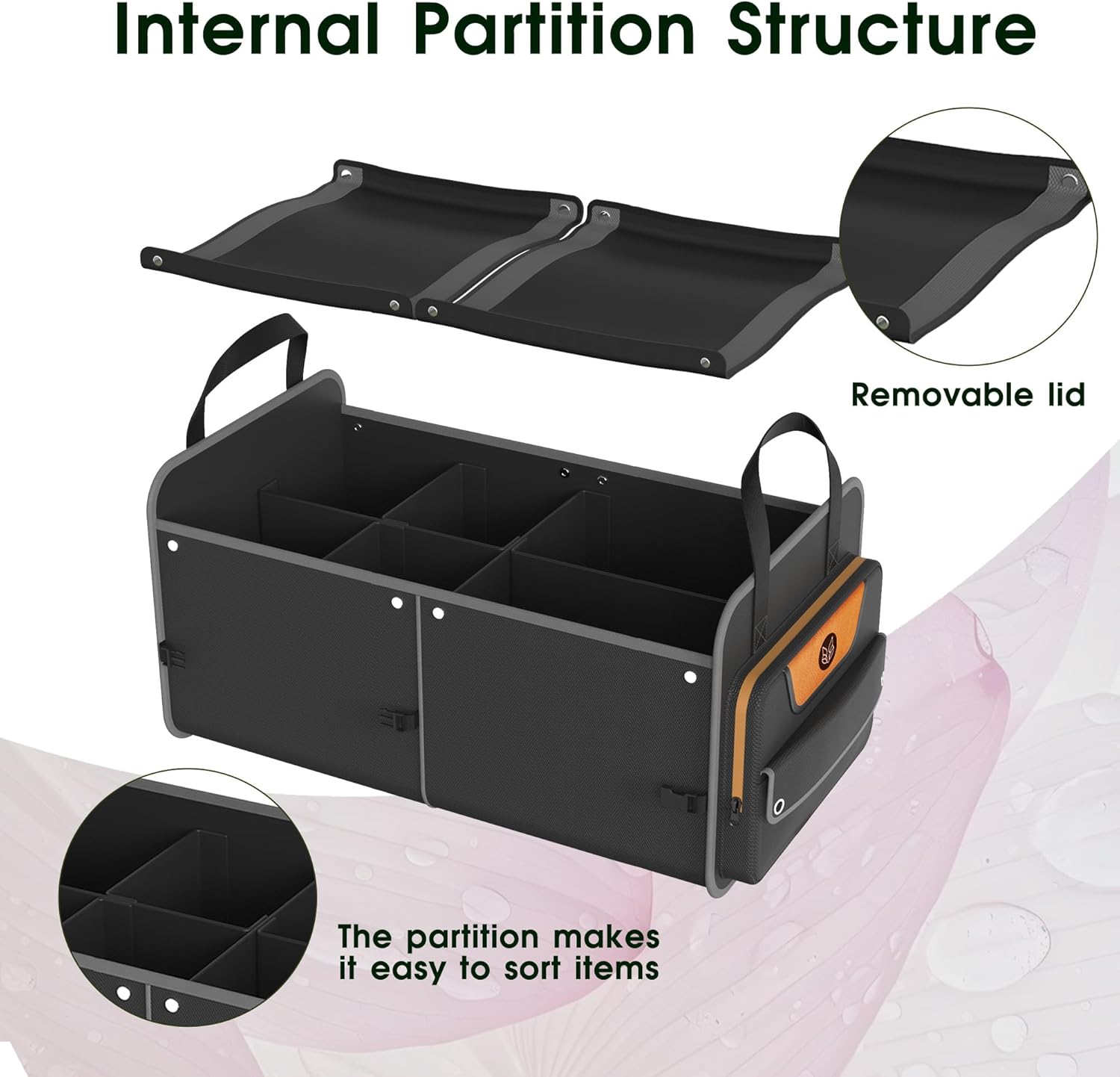 - Structural Design:The car storage organizer offers a 70L dual-compartment system (23.2"×13.8"×11.8") with adjustable dividers for versatile organization. A detachable mesh top expands vertically to store tall items like wine bottles, while its collapsible design folds to 3 inches when empty, optimizing space efficiency in your SUV trunk organizer.