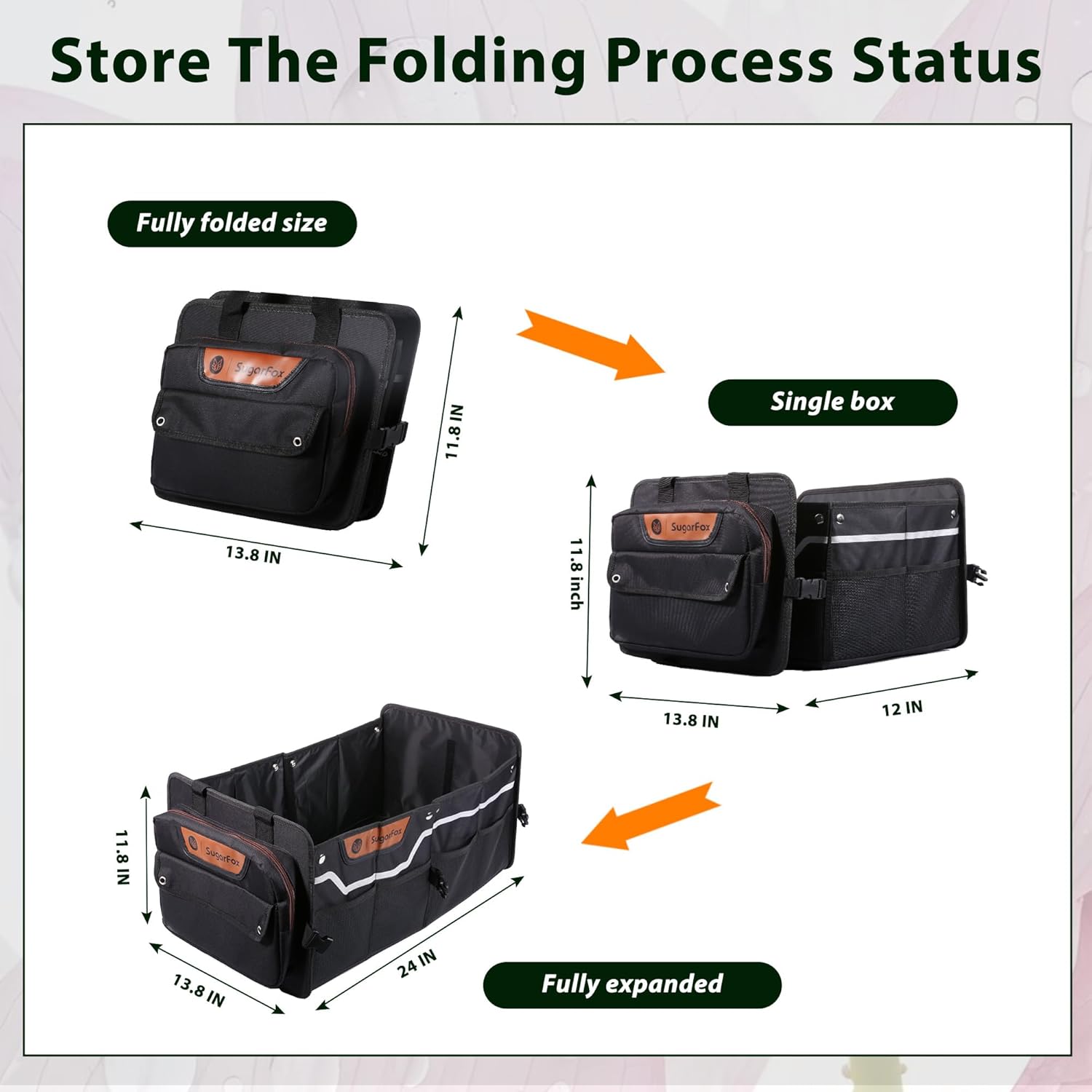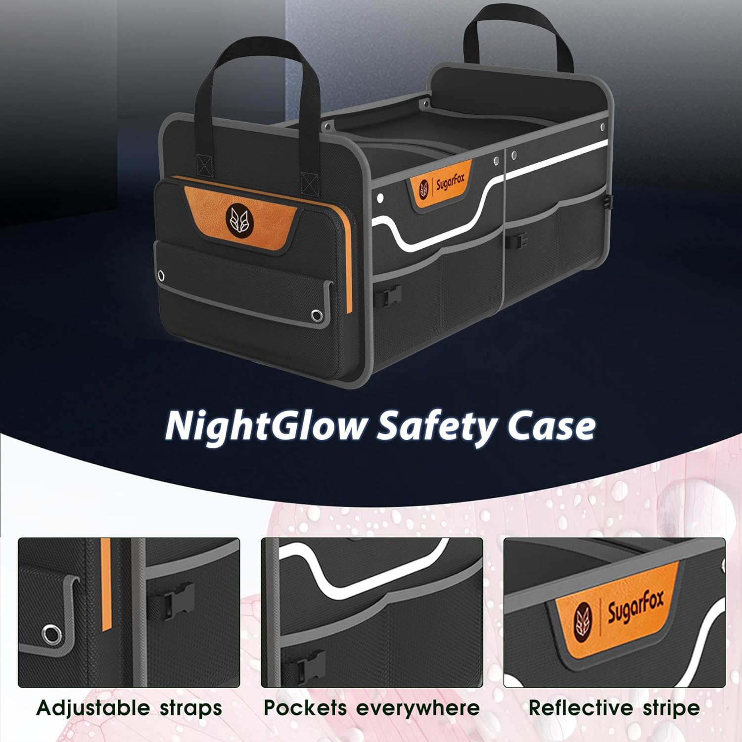 - Material & Craftsmanship:This premium trunk organizer for SUV combines 600D PU-coated waterproof Oxford fabric with advanced hydrophobic treatment to repel spills and protect items. Enhanced with logo-embossed leather accents, this car storage solution merges durability with refined aesthetics. Fluorescent-reflective strips on the front panel align seamlessly with leather detailing, ensuring nighttime visibility while elevating the car organizer’s modern design.