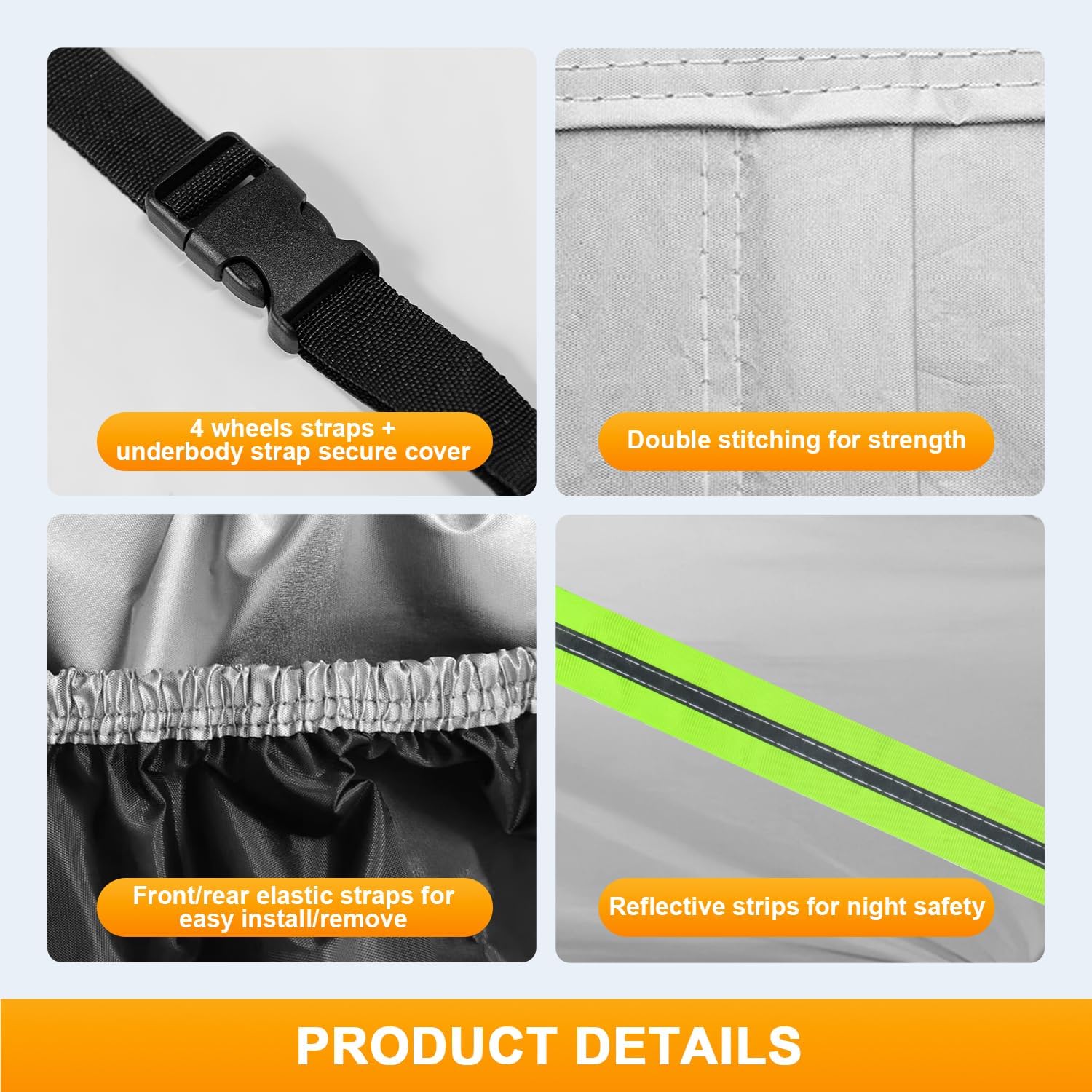 - Enhanced Nighttime Visibility: Safety is a priority with our car cover small sedan, which includes reflective safety strips that increase visibility at night. These features are critical for preventing accidents and ensuring your vehicle is seen in low-light conditions, adding an extra layer of security while parked, particularly for those looking for car cover waterproof all weather or hail car cover