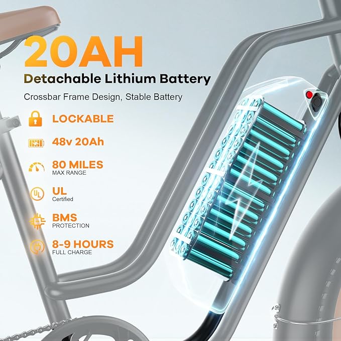 - ๐๐๐ ๐๐๐๐ก ๐๐จ๐ง๐ ๐๐๐ง๐ ๐ ๐๐๐ฆ๐จ๐ฏ๐๐๐ฅ๐ ๐๐๐ญ๐ญ๐๐ซ๐ฒ:Not only the excellent motor but also an upgraded battery equipped. The 48V 20Ah lithium-ion battery covers a range of 40-80 miles per full charge. The removable battery design makes charging more convenient. Dustproof and dampproof, guarantee the safety and life of the battery. Effortlessly cruise, exercise, or commute seamlessly with this long range e-bike.