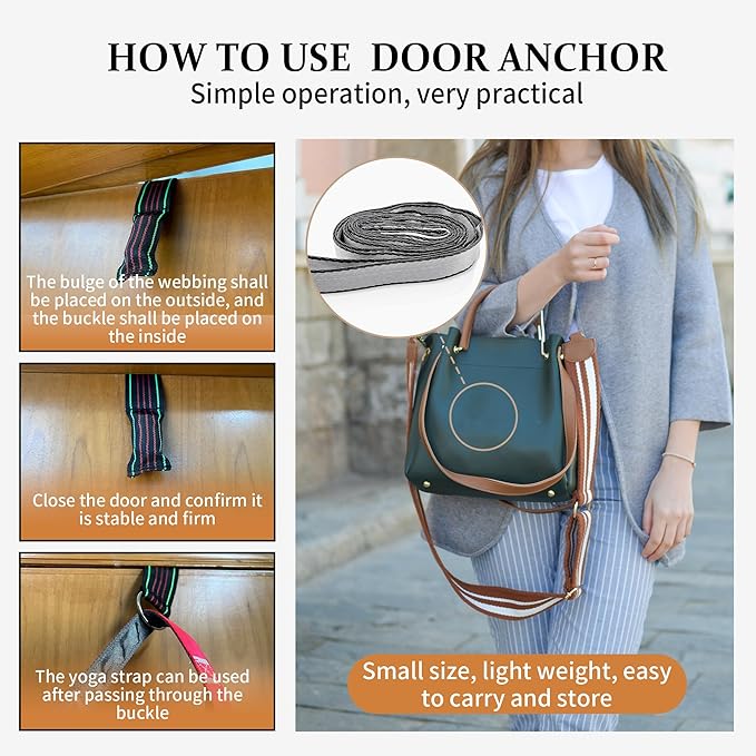 - 【EQUIPPED WITH DOOR STOP&PORTABLE】It has a wide range of use scenarios, and is very suitable for going out, working in the studio or at home. We are equipped with a door anchor, so we can easily use our yoga straps anytime, anywhere. Especially, it's more efficient to use it after warm-up, exercise and exercise; Perfect for dancers and athletes, it can also be used for physical therapy, Pilates and yoga.