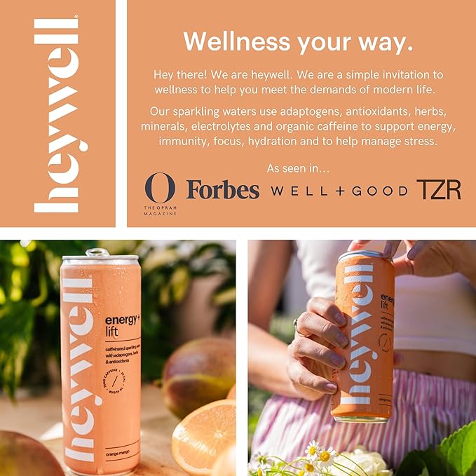 - VARIETY PACK – Cherry Limeade & Orange Mango This Heywell variety pack includes two refreshing flavors designed to support energy, focus, immunity, and stress relief. Lightly sparkling with just 10 calories and 1g sugar, these adaptogen drinks are made with organic ingredients, electrolytes, and are Non-GMO, Vegan, Gluten Free, and alcohol-free—perfect as a functional mocktail or daily boost.