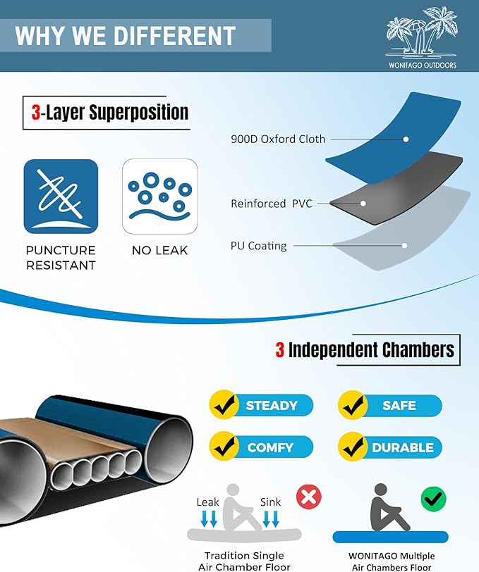 - HIGH-QUALITY INFLATABLE KAYAK --- Made of durable PVC material covered with Oxford cloth outside, providing better performance than ordinary PVC inflatable kayaks. With this durable material, you can be confident that our touring kayak will last for many adventures to come