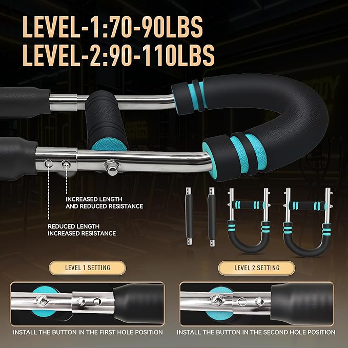 • Adjustable Twister Arm Trainer for Muscle Growth.Achieve targeted strength gains with our Twister Arm Trainer,designed for arm,shoulder,chest workouts. The two-stage resistance (Level 1: 70lbs, Level 2: 130lbs) caters to all skill levels, while the reinforced steel spring ensures durability.Perfect for saker twister arm trainer routines,its ergonomic foam-wrapped handles reduce fatigue during intense sessions.As a good selling arm trainer for men,this arm trainer is a must-have for home gyms