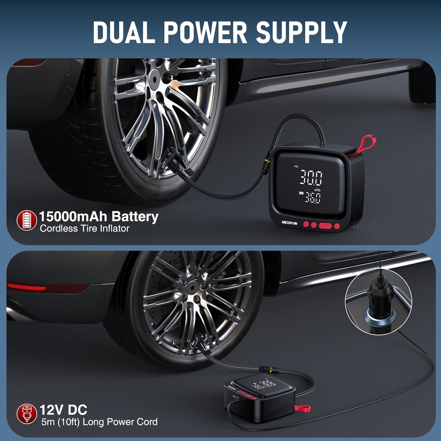 - DUAL POWER MODES: This car tire air pump is equipped with a 15000mAh rechargeable battery and features a wireless design for easy inflation, bringing flexible portability to your journey. At the same time, it is equipped with a 12V DC adapter as a backup power source, so you don't have to worry about the battery running out during the journey. In addition, the tire inflator also has an automatic shut-off function. After reaching the preset pressure value, the tire inflator will stop working.