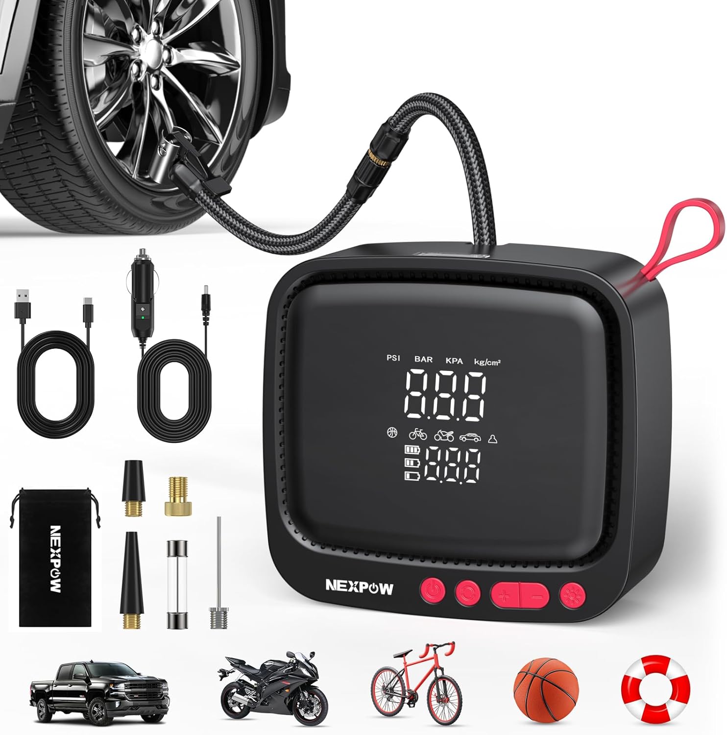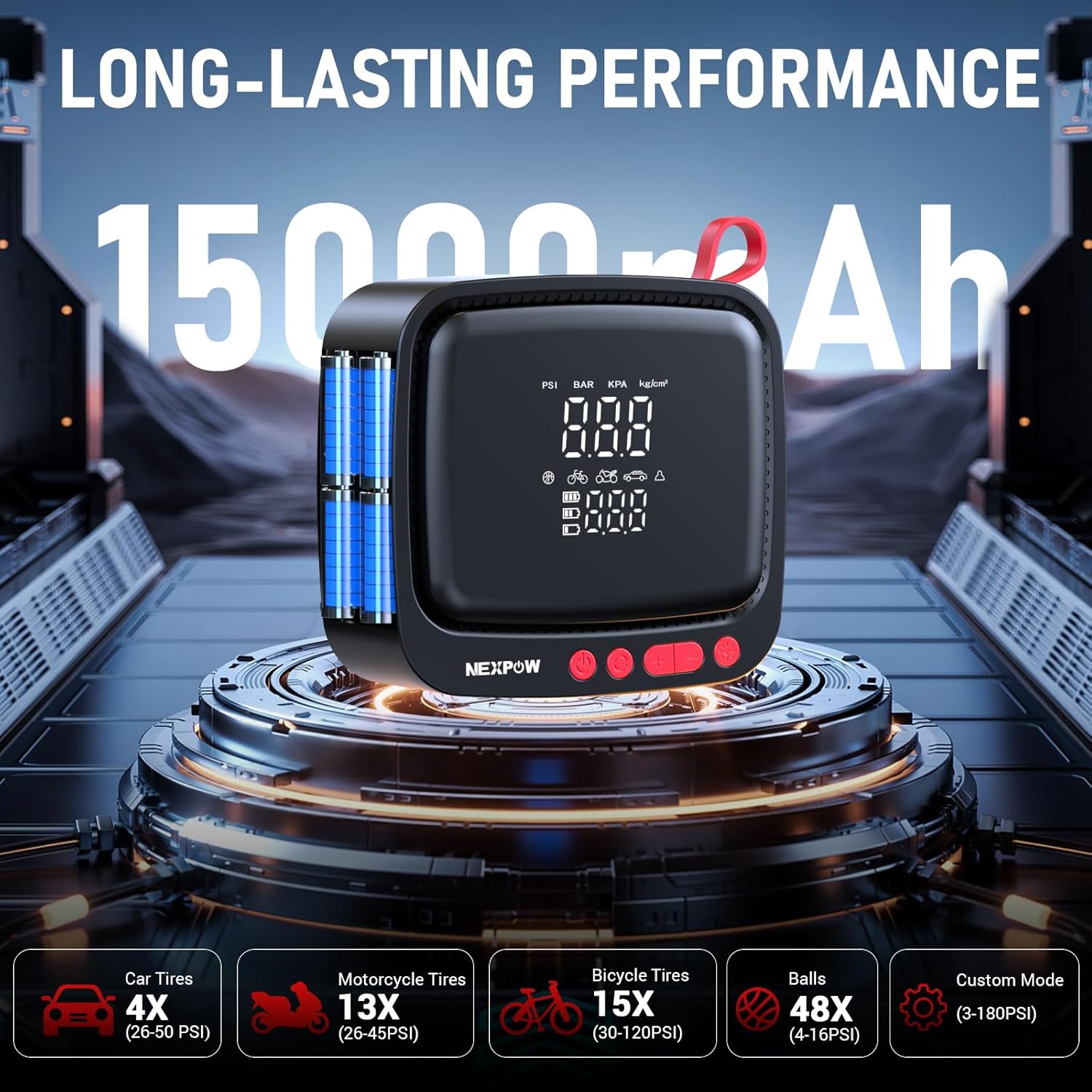 NEXPOW Tire Inflator Portable Air Compressor, 180 PSI Cordless Air Pump for Car Tires with Dual Digital Pressure Gauge & Auto Shut-Off, Portable Tire Pump for Car, Motorcycle, Bicycle, Ball and More