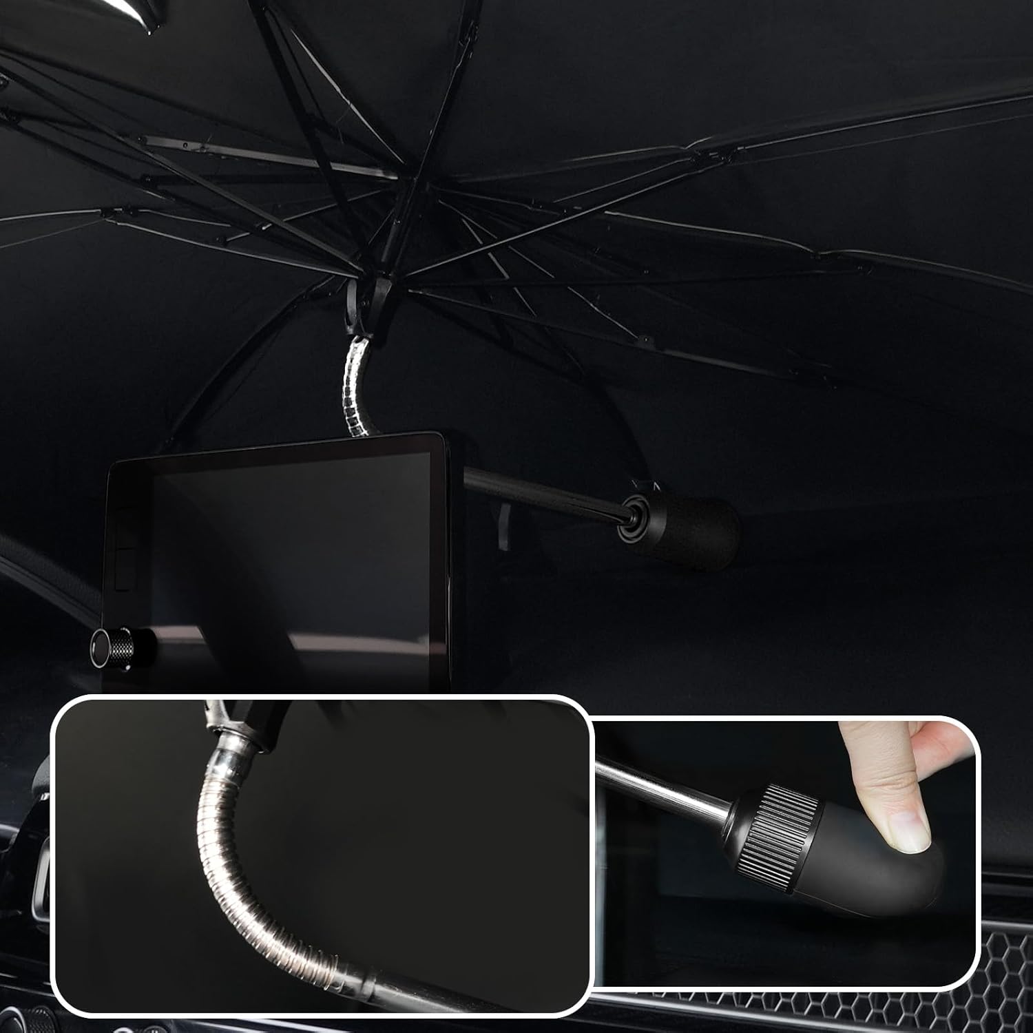 - DURABILITY: Built with 10 robust umbrella ribs, this front windshield umbrella sunshade is extremely sturdy. The bendable tubes can be flexed 360°, and the silicone tips protect your car's interior from scratches and damage, ensuring long-lasting use and peace of mind.