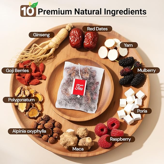 - 10 PREMIUM NATURAL INGREDIENTS: Our ginseng five treasures tea kidney tea crafted with carefully selected ingredients including ginseng, wolfberry, yam, red dates, poria, polygonatum, mulberry, maca, raspberry, and yizhiren through scientifically proportioned without any additives, The synergistic blend boosts efficacy, offering you a mild and health-focused formula you can trust