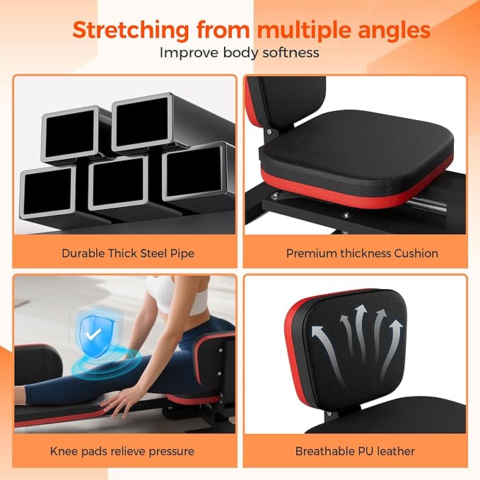 - 【Comfortable Leg Stretcher】: The footrests, seat, and back support are all made of PU material and thick foamed cotton padding, it will make your flexibility training comfortable.