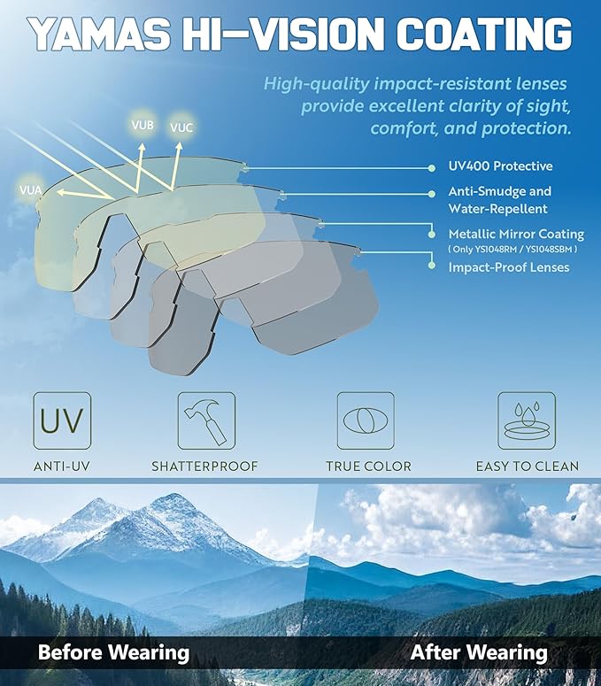 - UV400 Protection: Protect your eyes and enjoy clear vision in sunny conditions with the YAMAS YS1048RM. Its Red Mirror coating minimizes glare, maximizes visual clarity, and provides comprehensive UV400 protection.