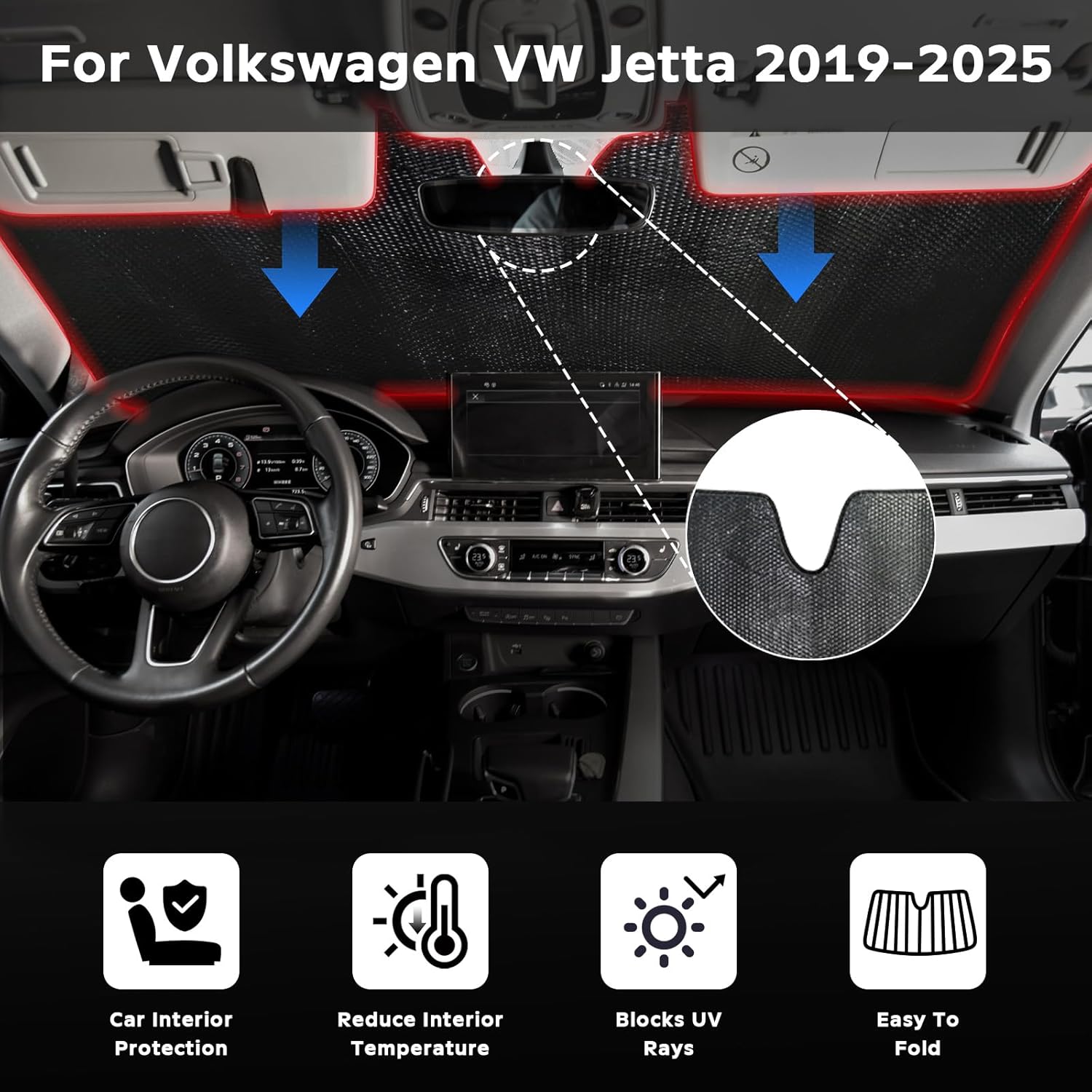 - Precise Fit: This sunshade designed specifically for the Volkswagen VW Jetta 2019-2025 front windshield. Blocks 99% of infrared radiation; reduces interior temperature. Protects dashboard/leather from radiation and high temperatures, preventing cracking