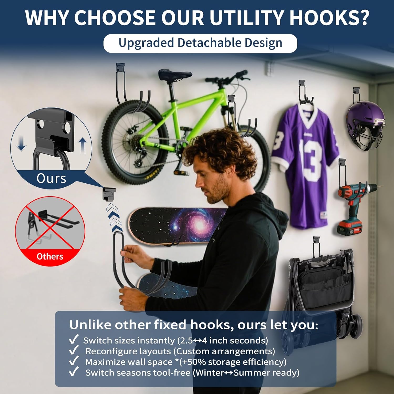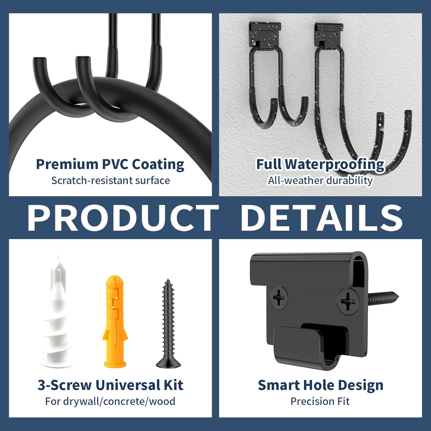 - Non-Slip Rubber Coated Hooks: Premium rubber coating protects expensive items like bikes and helmets. Curved hook design prevents slipping - superior garage tool hangers
