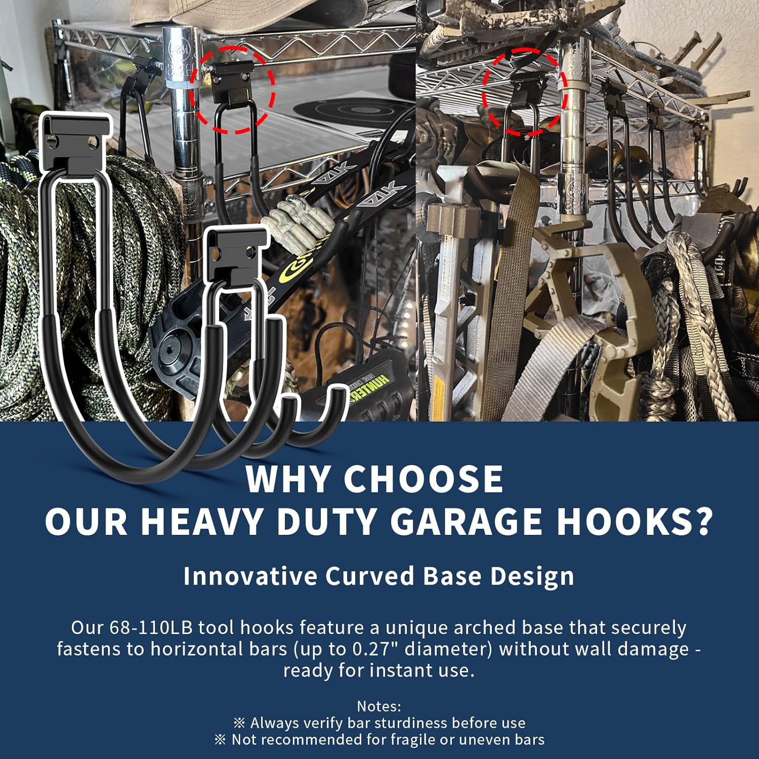 Garage Hooks Heavy Duty, 6pcs 68-110 LB Garage Organization and Storage Wall Hooks for Hanging Ladder/Bike/Power and Yard Tools/Hose, Utility Hook Tool Hangers for Garden/Shed/Apartment