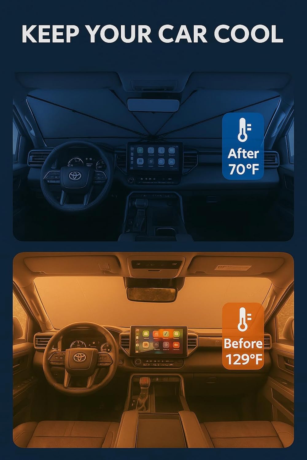 - Certified Sustainable. Customized Windshield Sunshade: Specially designed for the 2023-2025 Toyota Sequoia with precise mirror cutouts, providing 100% shading, carbon fiber handle, ensuring lightweight and durability while also having a fashionable feel. Our Sequoia windshield sunshade can protect the interior of your car from various light damage and prevent dashboard and seat degradation.