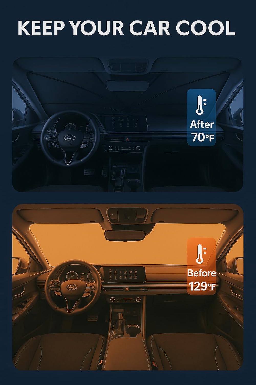 - Innovative Ice Crystal Material: The sunshade adopts a 4-layer design, which is thick enough to effectively block and reflect sunlight. After multiple uses, it is still strong and not easy to tear. The sunshade also uses innovative ice crystal materials to evenly distribute heat, quickly cool down, and keep your car cool all the time. You no longer have to worry about getting your seat or car handle scalded by high temperatures.