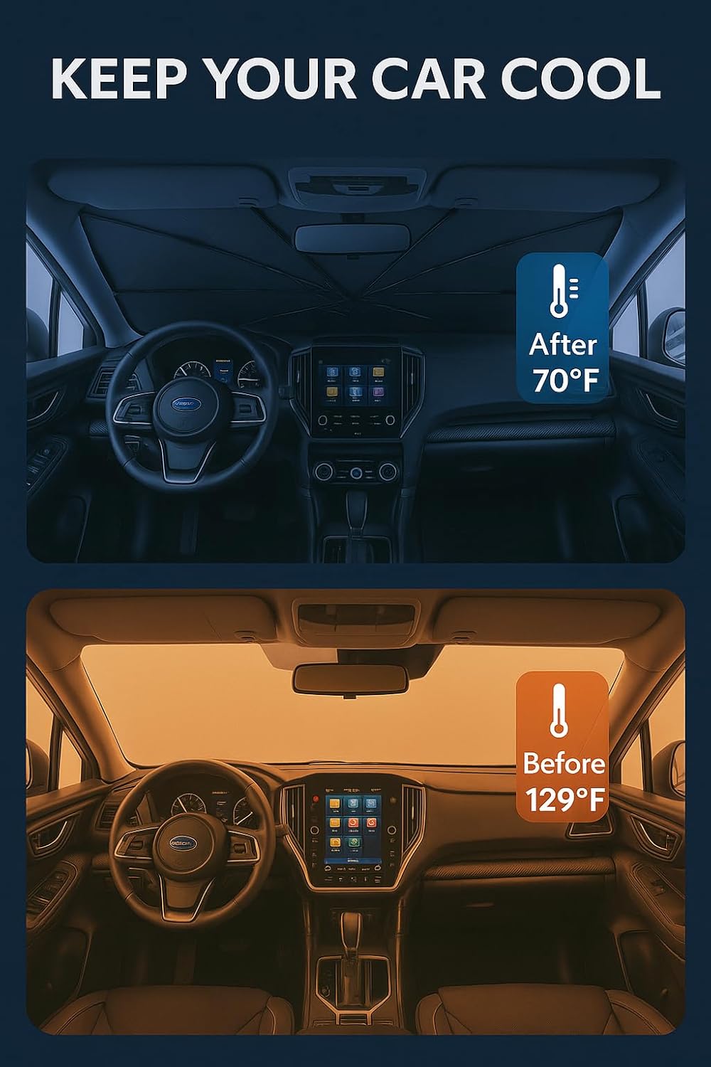 - Innovative Ice Crystal Material: The sunshade adopts a 4-layer design, which is thick enough to effectively block and reflect sunlight. After multiple uses, it is still strong and not easy to tear. The sunshade also uses innovative ice crystal materials to evenly distribute heat, quickly cool down, and keep your car cool all the time. You no longer have to worry about getting your seat or car handle scalded by high temperatures.