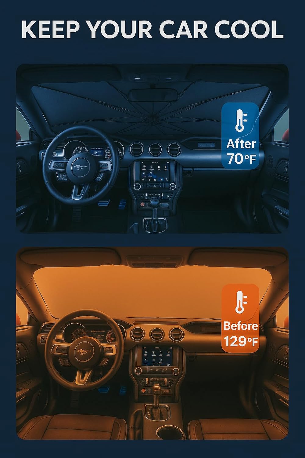 - Certified Sustainable. Customized Windshield Sunshade: Specially designed for the 2015-2023 Ford Mustang with precise mirror cutouts, providing 100% shading, carbon fiber handle, ensuring lightweight and durability while also having a fashionable feel. Our Mustang windshield sunshade can protect the interior of your car from various light damage and prevent dashboard and seat degradation.