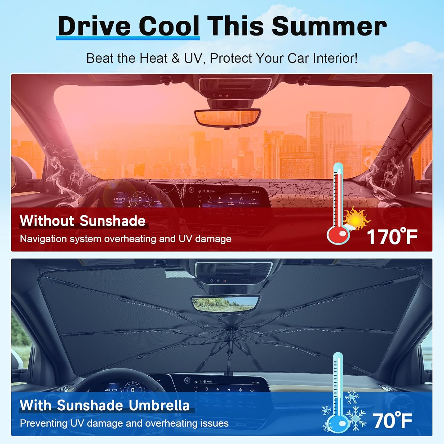 - 5. Portable & Universal Fit: Folding to umbrella size, easy to store and carry. Compatible with 2025 Equinox EV/Equinox/Grand Highlander/Santa Fe/Ioniq 5/Forester/Telluride/Ridgeline/Ranger/Tundra/Sierra/Silverado 1500/Wagoneer/Grand Wagoneer/Enclave, it provides adjustable coverage and adapts to most windshields, with slight adjustments for a better fit