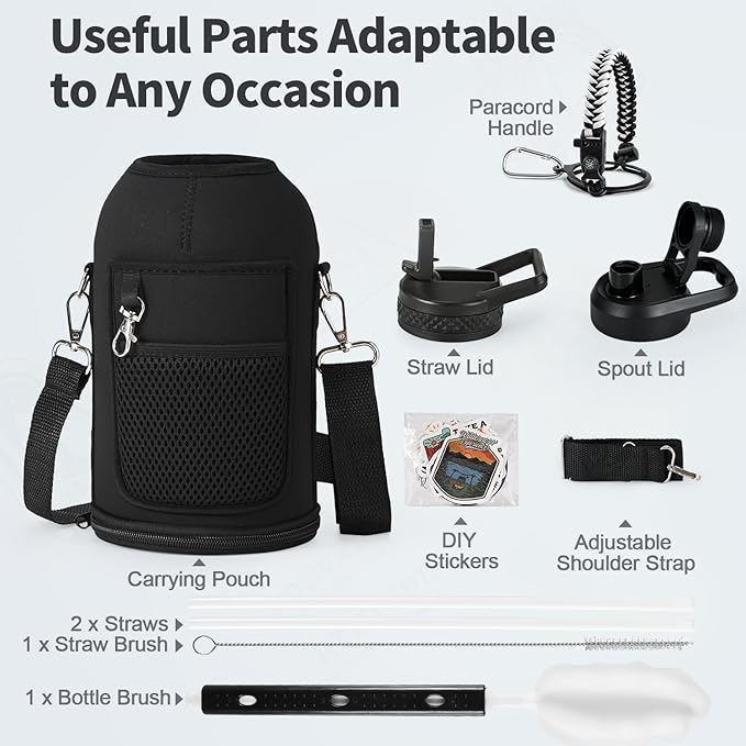 - After Services and Package: We offer continuous after-sales service against leakage and poor cold/hot-keeping capability, we are committed to 100% customer satisfaction. Your purchase includes: WixByti 64oz Water Bottle, Carrying Pouch with Adjustable Strap, Straw Lid with 2 Straws & 1 Straw Brush, Spout Lid, Paracord Handle, Water Bottle Stickers