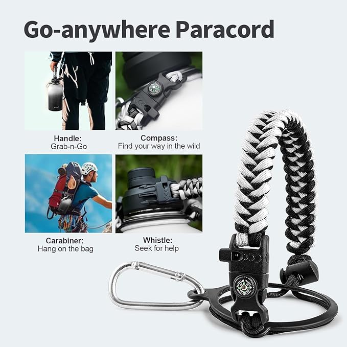 - Palm Fitting Paracord Handle: Compared to handle lids, nylon paracord on the bottle gives you more choices in terms of color coordination and coziness on your hands. Match the handle with your bottle to make a complete outdoorsy look. Compass and carabiner can be lifesavers for hiking and other expeditions