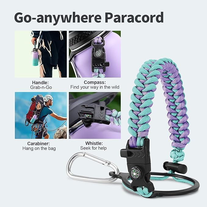 - Palm Fitting Paracord Handle: Compared to handle lids, nylon paracord on the bottle gives you more choices in terms of color coordination and coziness on your hands. Match the handle with your bottle to make a complete outdoorsy look. Compass and carabiner can be lifesavers for hiking and other expeditions