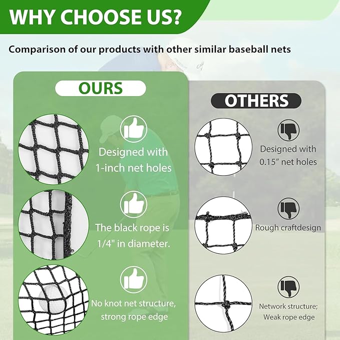 - 【Easy Installed Nets】Set up and tear down in minutes; Our nets are light and portable for trips to the park, parties, and impromptu gatherings; Hang from trees, poles, hooks, and Works great as a barrier for backyard or outdoors; Great for Backyard Golf, Hockey, Baseball, Softball and Soccer Practice
