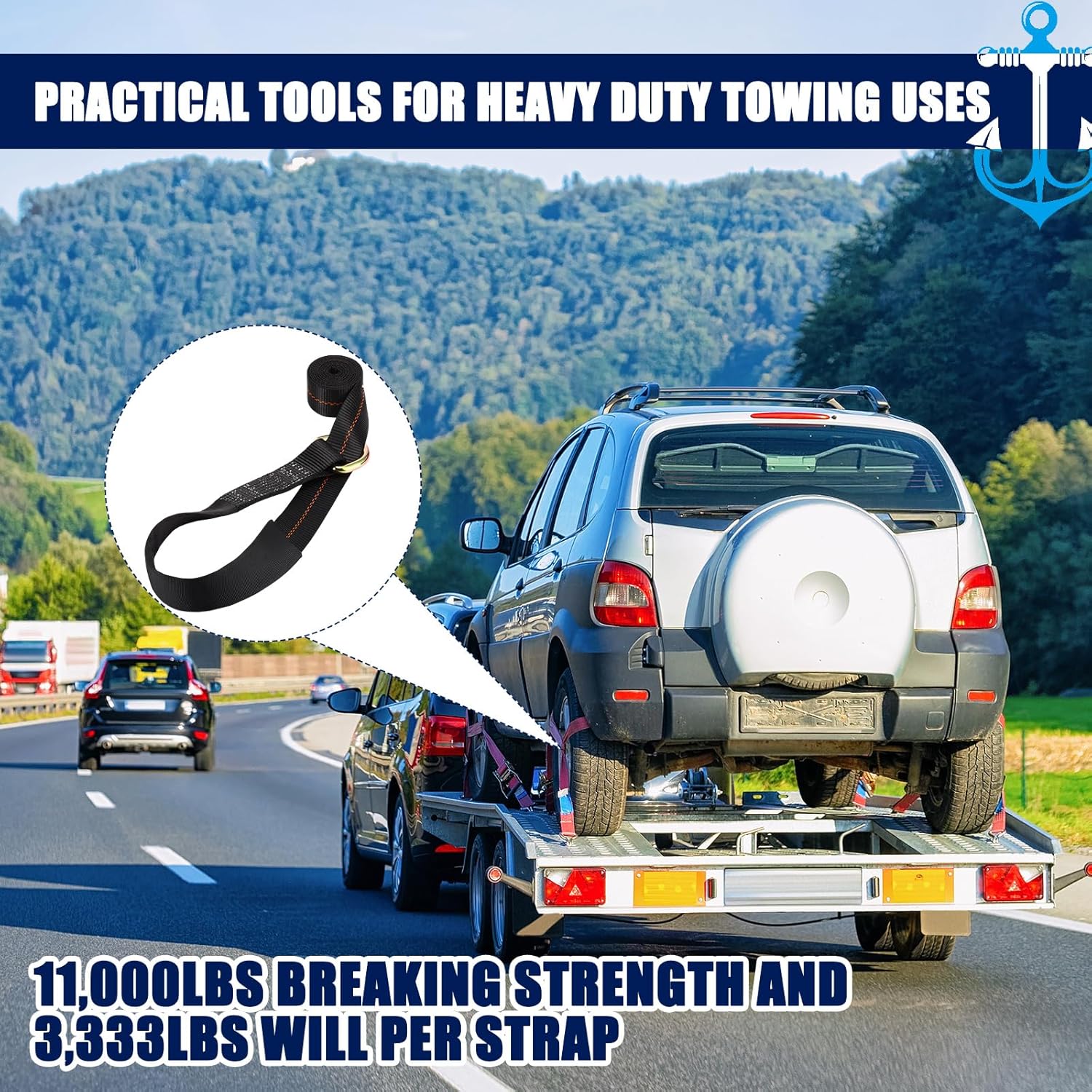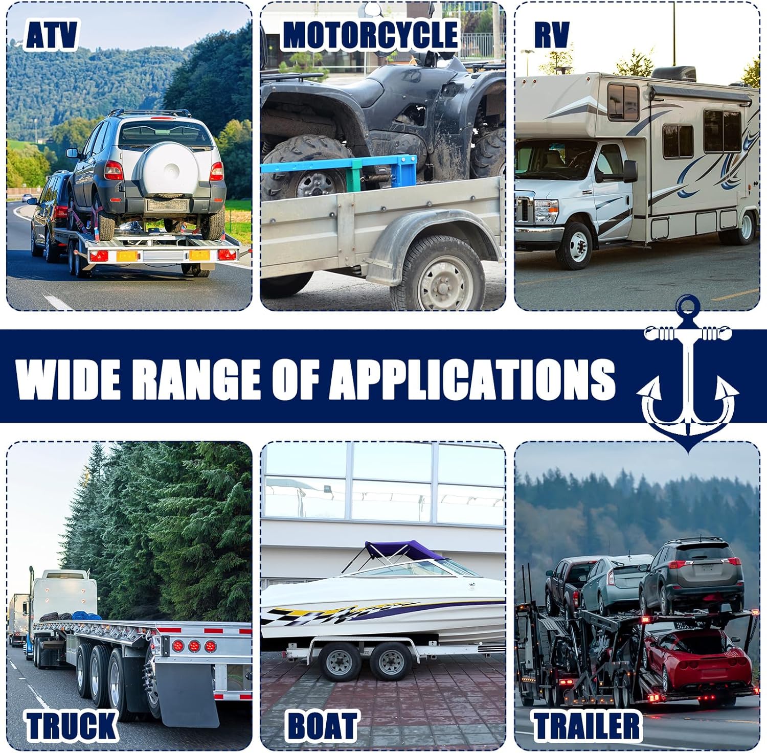 - Wide Applicability: made to fit a variety of situations; Whether you're towing a car, truck, sedan, coupes, sport, ATV, UTV, or a boat, these straps will serve you well; These straps for trailer's size and strength make them ideally suited for both recreational and commercial use