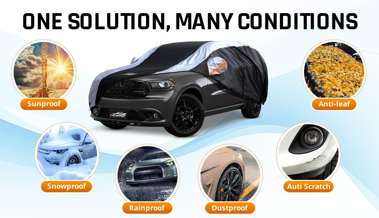 Dodge Durango Car Cover Waterproof All Weather with Silver Strip Design, Custom Fit for Dodge Durango 2005–2025, Durango Accessory with Door Zipper & Windproof Straps