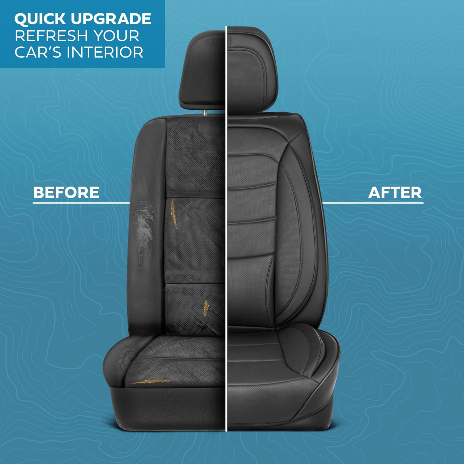- ULTIMATE PROTECTION: MotorBox faux leather car seat covers offer ultimate protection against spills, stains, dirt, and wear. Designed to shield your seats from daily damage, these covers help maintain the original condition of your car’s interior, ensuring durability and extending the lifespan of your vehicle’s seats. Not just for cars, these are leather seat covers for trucks & SUVs too!