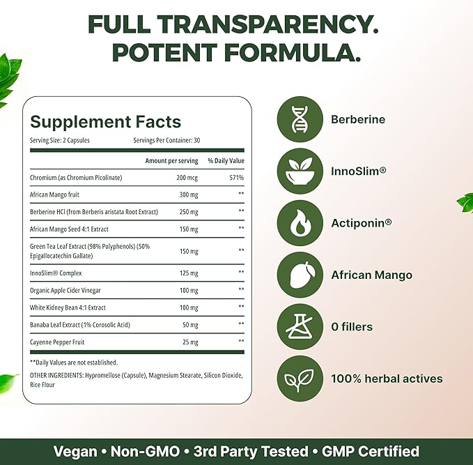 - RESEARCH-BACKED INGREDIENTS: Features premium Berberine HCl, InnoSlim, Actiponin, African Mango extract, Apple Cider Vinegar, White Kidney Bean extract, Green Tea Extract, Banaba Leaf, Bitter Melon, and BioPerine for enhanced absorption and metabolic support.