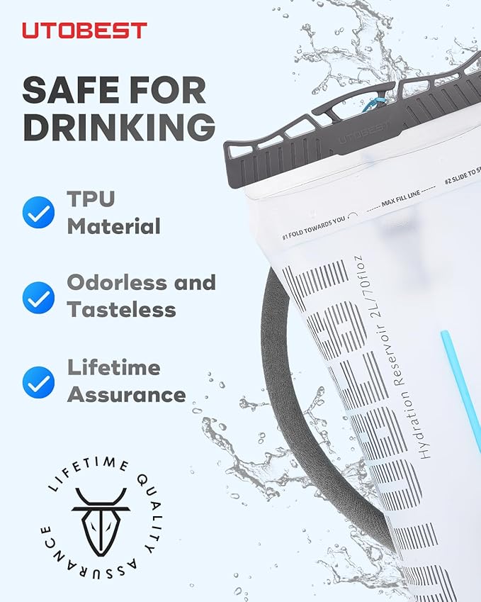 - Safe Drinking: UTOBEST 2L hydration bladder is made of food-grade TPU, safer and more durable than PEVA/EVA. Odorless, tasteless, and BPA-free. The soft bite valve has a protective cap to keep dirt out, ensuring safe drinking