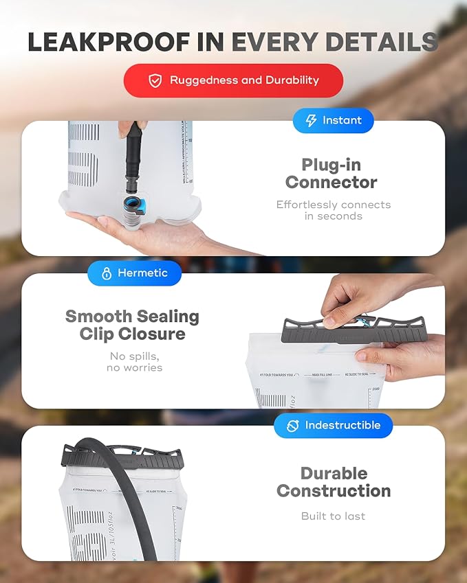 - Easy Drinking: The hiking bladder features a soft silicone bite valve for high flow with a pull-to-drink and push-to-lock mechanism, preventing leaks. The 2L bladder has a quick-release hose and an insulated tube to keep water fresh and cool in any season