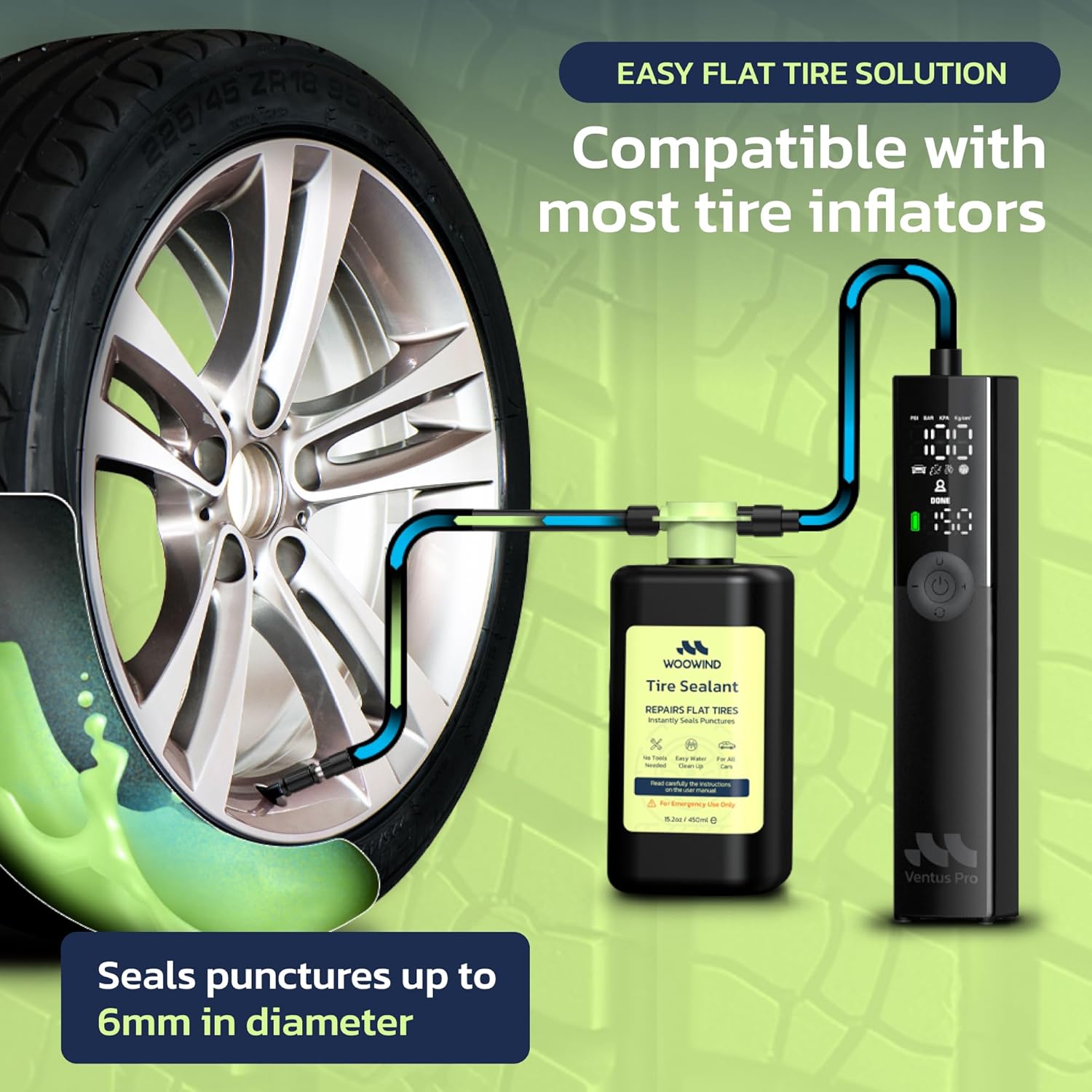 Tire Inflator Portable Air Compressor for Car, Bike, Motorcycle, SUV, Offroad & Truck - Fast Car Pump, 150 PSI, Cordless 12V DC, LED Display Emergency Light Woowind (Ventus pro + Tire sealant)