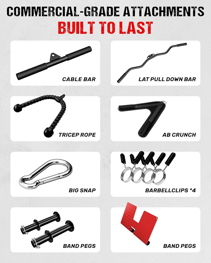 - 【Pro-Grade Attachments Included】: Customize every workout like a pro! Comes ready with essential tools: a Lat Bar for wide back development, a Cable Bar for versatile presses and curls, two band pegs for resistance helping to add versatility, a ab crunch and a tricep rope for core training. Instantly expand your exercise library and target every muscle group with precision.