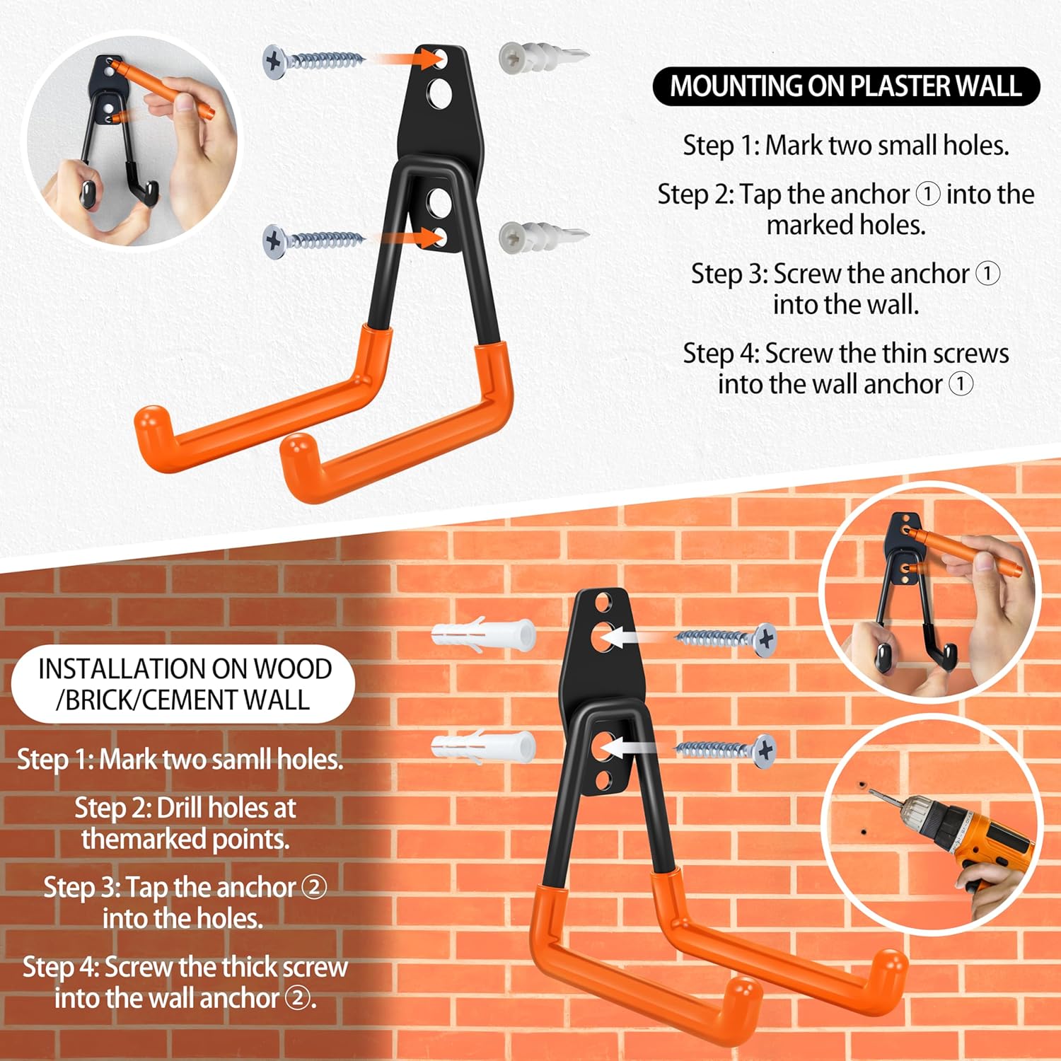 - Easy Installation: Enjoy hassle-free setup with our utility hooks that come with two types of screws and anchors, making them compatible with drywall, wood, brick, or concrete walls. Transform your garage organization!