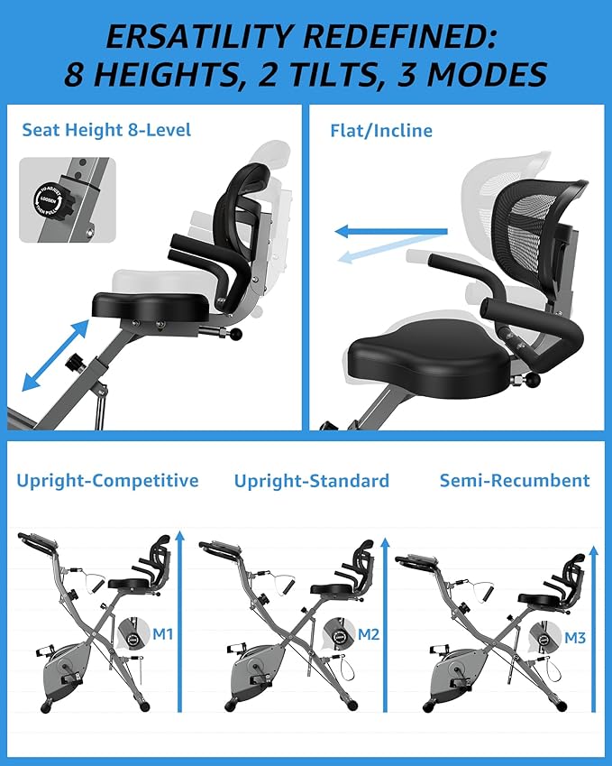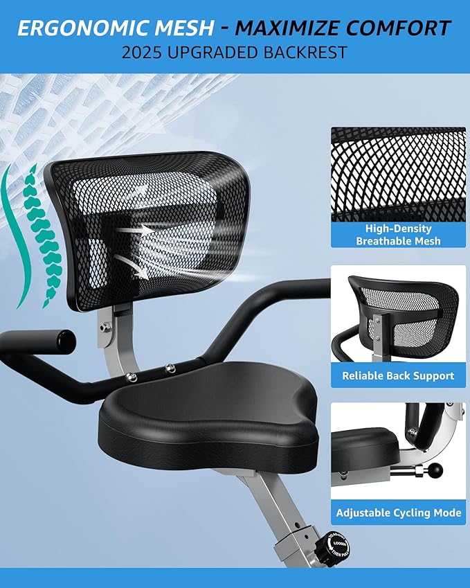 - 5-IN-1 MULTI-FUNCTIONAL EXERCISE BIKE WITH BREATHABLE SUPPORT: Transition effortlessly between three modes. Our upgraded ventilated mesh backrest elevates every position with airflow-rich comfort, offering full-back support that keeps you cool during intense sessions while maintaining spinal alignment. Beyond versatile cycling modes, dual hand pull cords sculpt upper body strength and leg pull cords power up lower muscle groups.The anti-slip ergonomic design ensures stability for workouts.
