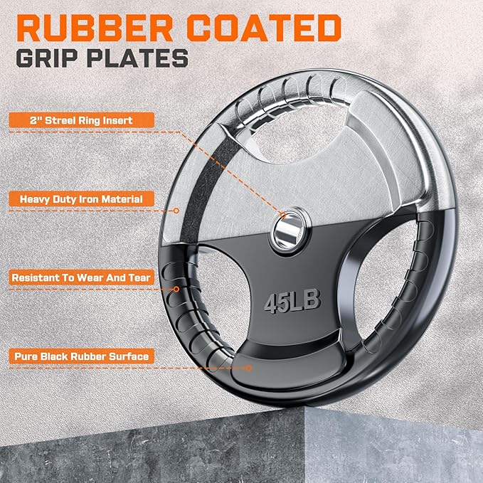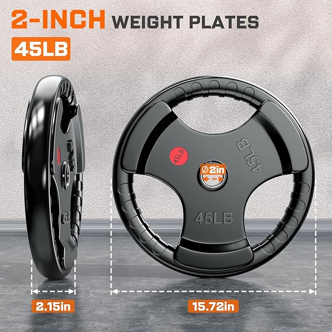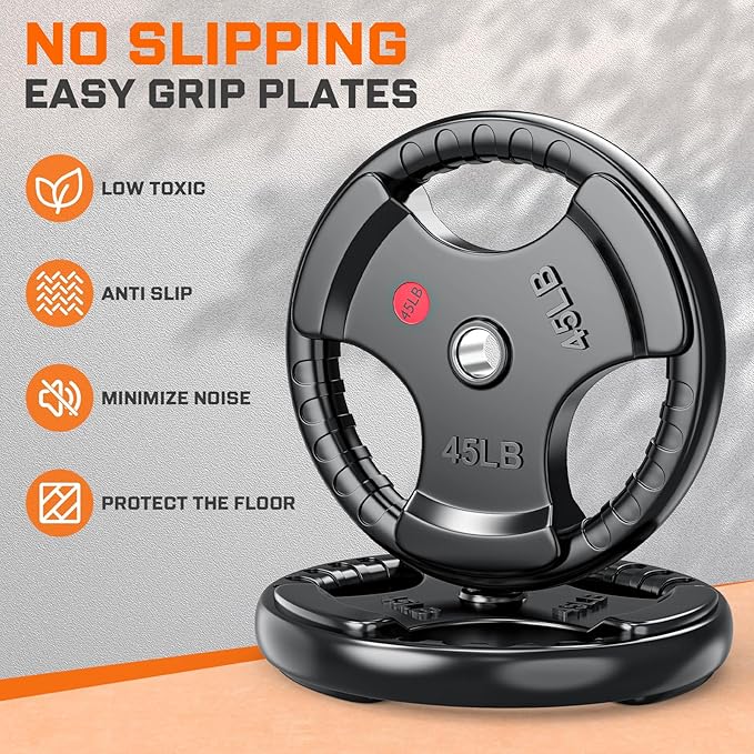 - EASY GRIP – The Olympic weight plates is designed with three holes and there are grooves in the grip holes for easy and safe handling when loading and unloading heavy objects. Descending and lowering after weight training is safer and more practical. The comfortable grip also gives you a good using experience