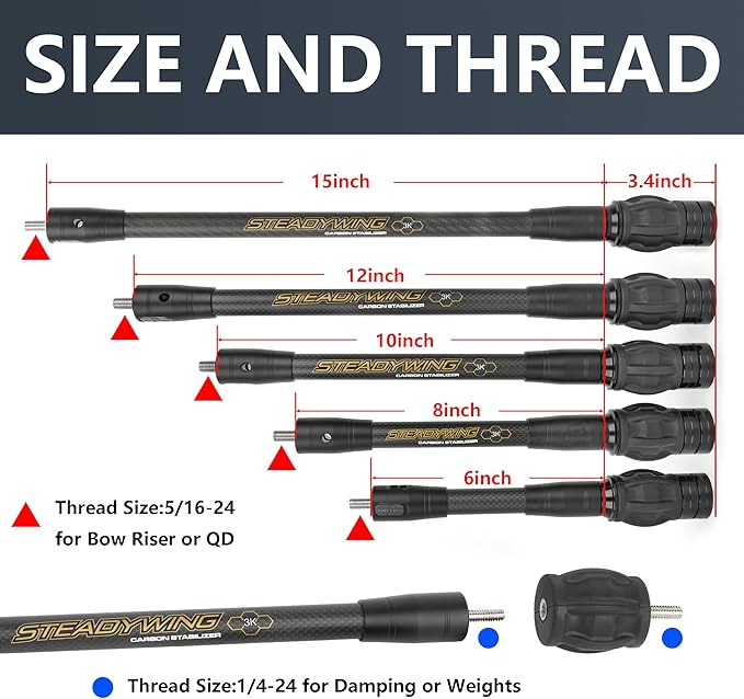 • Versatile Design: This archery bow stabilizer set includes 6", 8", 10", 12",and 15" rods, allowing you to customize the balance and stability of your compound bow.
