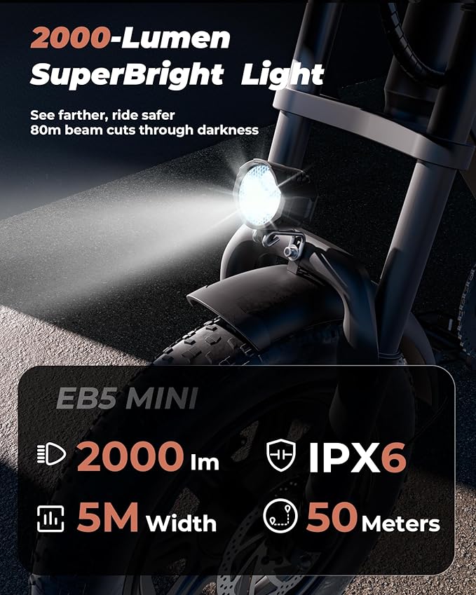 - All-Terrain Fat-Tire Beast – EB5 Mini electric bicyle equips 16"x4.0" puncture-proof tires with 3X wear-resistant layers and drainage grooves (5000Miles tested). Full suspension,Upgrade lights and dual mechanical discs conquer any terrain safely .