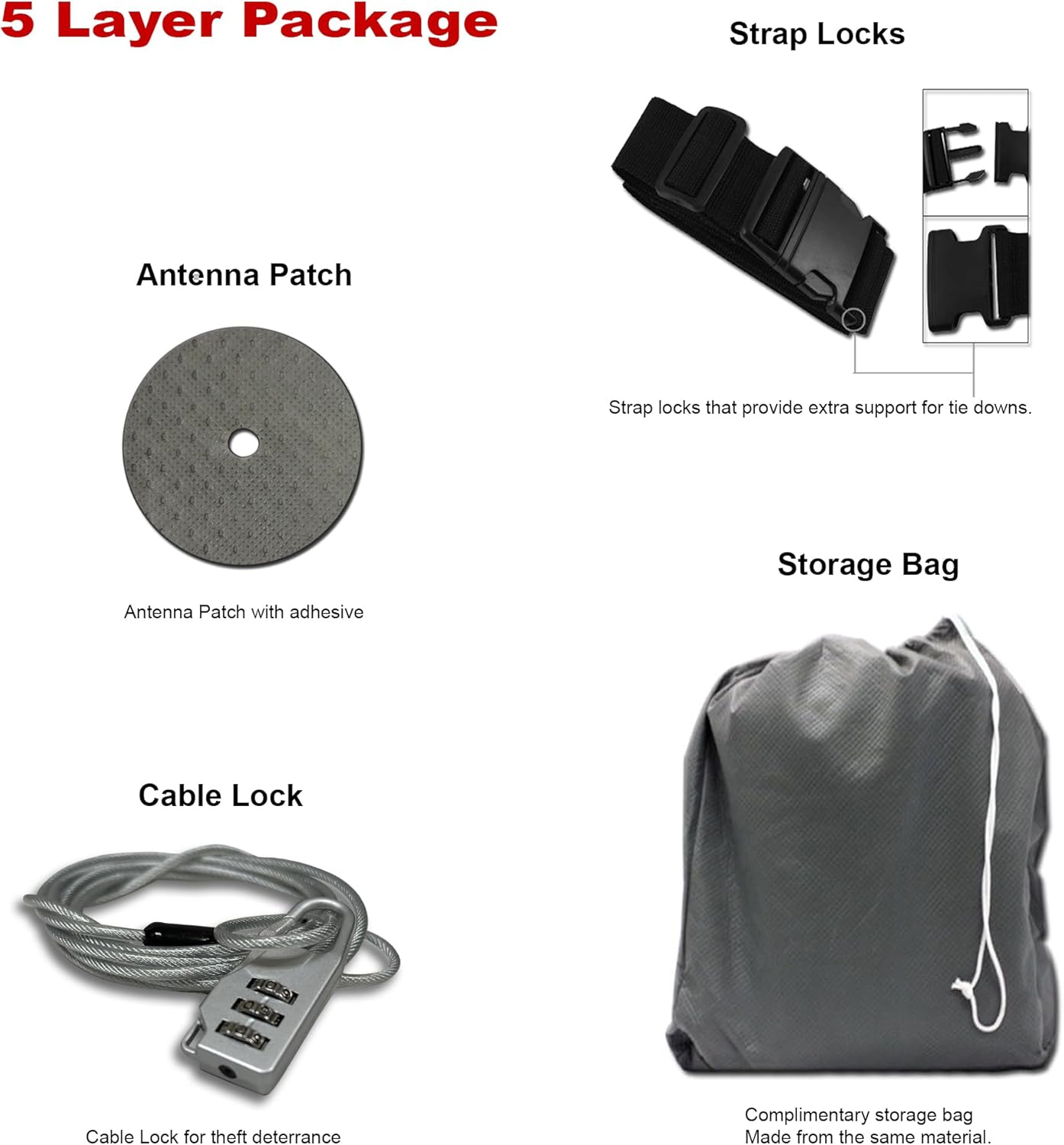 - COMPLETE COVERAGE ACCESSORIES Each purchase comes with essential accessories for added convenience and security. This includes an antenna reinforcement patch with adhesive, buckle strap locks for a firm hold, a cable and lock for enhanced security, and a durable storage bag made from the same tough material as the car cover. The storage bag is spacious enough to store the cover and any additional equipment, ensuring both durability and convenience.